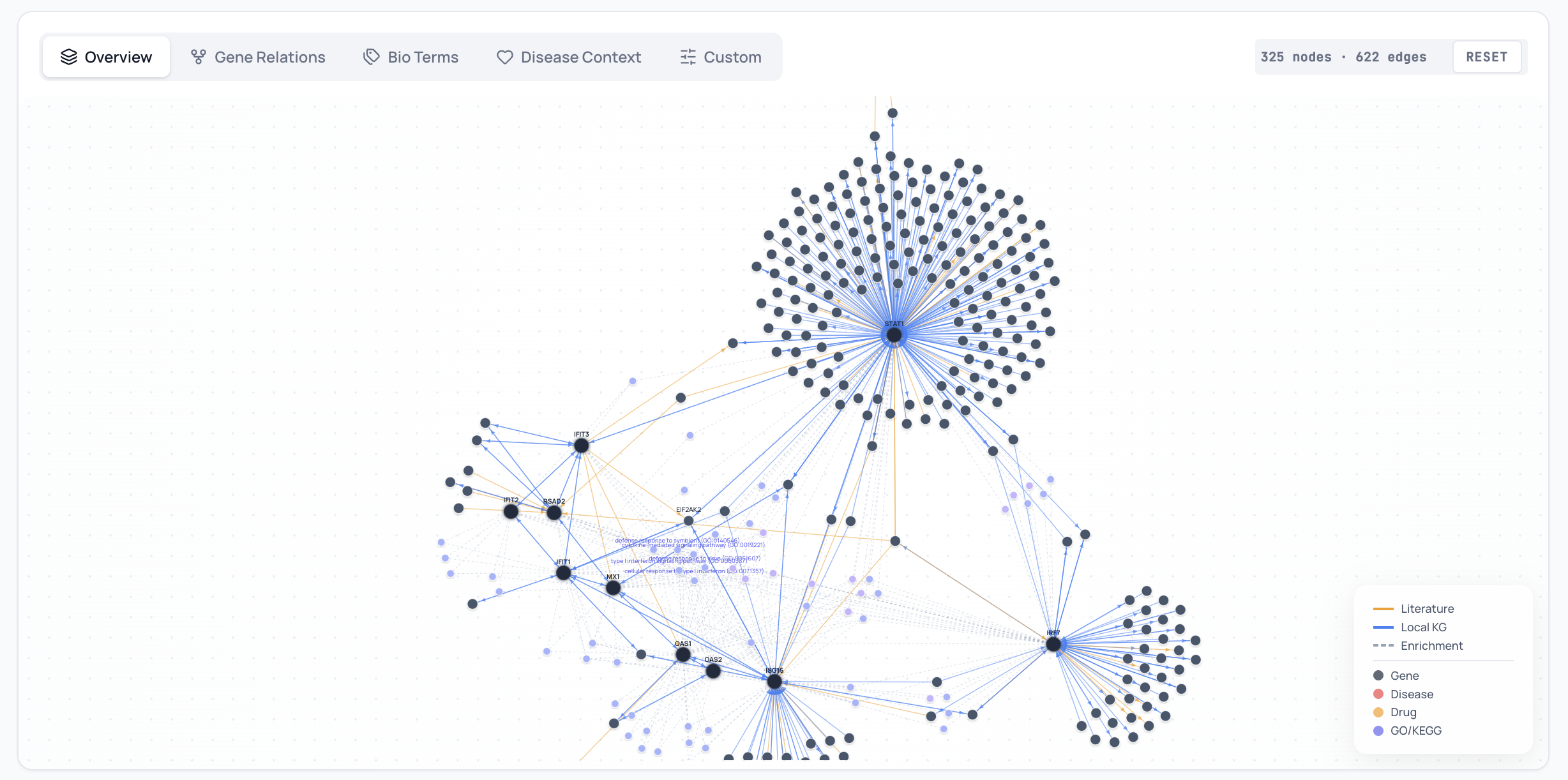 A modular framework that augments gene set enrichment (GO/KEGG ORA) with knowledge graph retrieval (~39M relations from STRING, KEGG, Reactome, PubTator) and parallel literature search from PubMed and the web. An LLM pipeline extracts biomedical relations and synthesizes narrative reports, streamed in real time to a Vue 3 frontend with an interactive D3 network graph and result-grounded chat assistant.